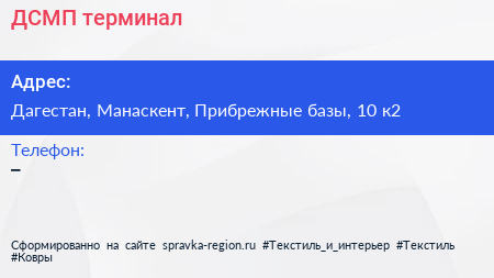ДСМП, терминал по адресу Дагестан, Манаскент, Прибрежные базы, 10 к2 в дальнейшем Организация, размещена в следующих категориях: