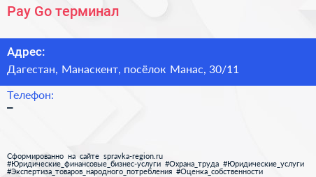 Pay-Go, терминал по адресу Дагестан, Манаскент, посёлок Манас, 30/11 в дальнейшем Организация, размещена в следующих категориях:
