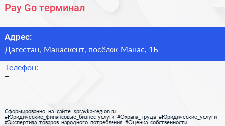 Pay-Go, терминал по адресу Дагестан, Манаскент, посёлок Манас, 1Б в дальнейшем Организация, размещена в следующих категориях: