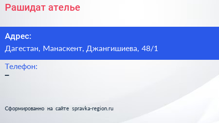 Рашидат, ателье по адресу Дагестан, Манаскент, Джангишиева, 48/1 в дальнейшем Организация, размещена в следующих категориях: