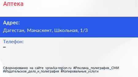 Аптека по адресу Дагестан, Манаскент, Школьная, 1/3 в дальнейшем Организация, размещена в следующих категориях: