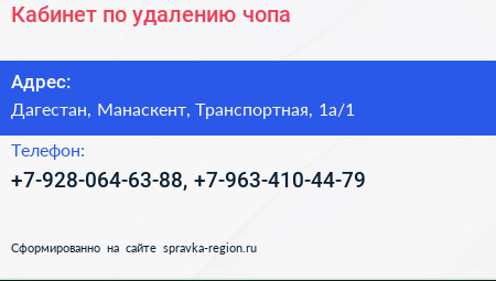 Кабинет по удалению чопа по адресу Дагестан, Манаскент, Транспортная, 1а/1 в дальнейшем Организация, размещена в следующих категориях:
