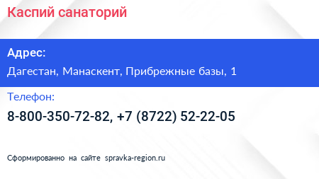 Каспий, санаторий по адресу Дагестан, Манаскент, Прибрежные базы, 1 в дальнейшем Организация, размещена в следующих категориях: