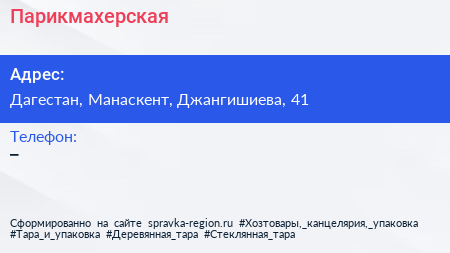 Парикмахерская по адресу Дагестан, Манаскент, Джангишиева, 41 в дальнейшем Организация, размещена в следующих категориях: