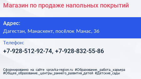 Магазин по продаже напольных покрытий по адресу Дагестан, Манаскент, посёлок Манас, 36 в дальнейшем Организация, размещена в следующих категориях: