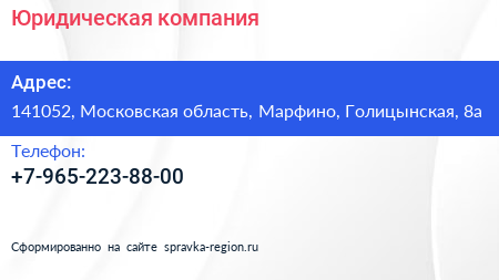 Юридическая компания по адресу 141052, Московская область, Марфино, Голицынская, 8а в дальнейшем Организация, размещена в следующих категориях: