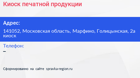 Киоск печатной продукции по адресу 141052, Московская область, Марфино, Голицынская, 2а киоск в дальнейшем Организация, размещена в следующих категориях: