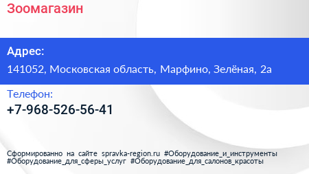 Зоомагазин по адресу 141052, Московская область, Марфино, Зелёная, 2а в дальнейшем Организация, размещена в следующих категориях: