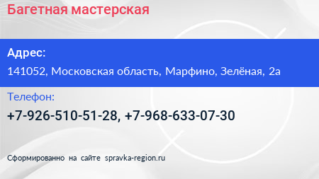 Багетная мастерская по адресу 141052, Московская область, Марфино, Зелёная, 2а в дальнейшем Организация, размещена в следующих категориях: