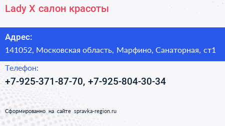Lady X, салон красоты по адресу 141052, Московская область, Марфино, Санаторная, ст1 в дальнейшем Организация, размещена в следующих категориях: