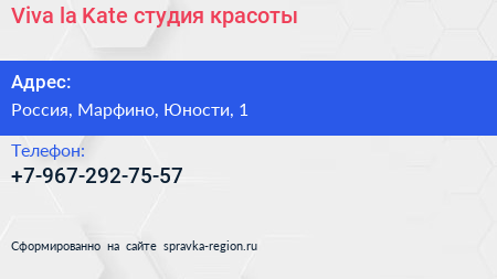 Viva la Kate, студия красоты по адресу Viva la Kate, 1, улица Юности, Жилой комплекс «Шолохово», Шолохово, городской округ Мытищи, Московская область, Центральный федеральный округ, 141052, Россия в дальнейшем Организация, размещена в следующих категориях: