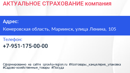 АКТУАЛЬНОЕ СТРАХОВАНИЕ, компания по адресу Кемеровская область, Мариинск, улица Ленина, 105 в дальнейшем Организация, размещена в следующих категориях: