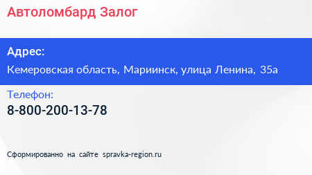 Автоломбард-Залог по адресу Кемеровская область, Мариинск, улица Ленина, 35а в дальнейшем Организация, размещена в следующих категориях: