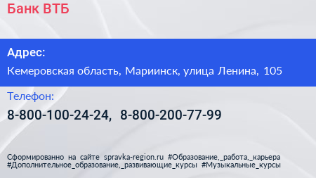 Банк ВТБ по адресу Кемеровская область, Мариинск, улица Ленина, 105 в дальнейшем Организация, размещена в следующих категориях: