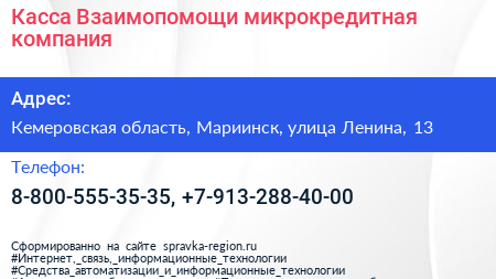 Касса Взаимопомощи, микрокредитная компания по адресу Кемеровская область, Мариинск, улица Ленина, 13 в дальнейшем Организация, размещена в следующих категориях: