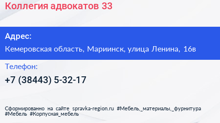 Коллегия адвокатов №33 по адресу Кемеровская область, Мариинск, улица Ленина, 16в в дальнейшем Организация, размещена в следующих категориях: