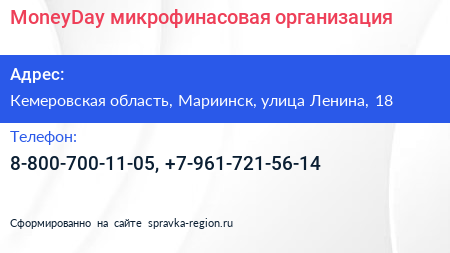 MoneyDay, микрофинасовая организация по адресу Кемеровская область, Мариинск, улица Ленина, 18 в дальнейшем Организация, размещена в следующих категориях: