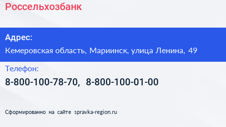 Россельхозбанк по адресу Кемеровская область, Мариинск, улица Ленина, 49 в дальнейшем Организация, размещена в следующих категориях: