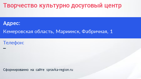 Творчество, культурно-досуговый центр по адресу Кемеровская область, Мариинск, Фабричная, 1 в дальнейшем Организация, размещена в следующих категориях: