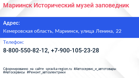 Мариинск Исторический, музей-заповедник по адресу Кемеровская область, Мариинск, улица Ленина, 22 в дальнейшем Организация, размещена в следующих категориях: