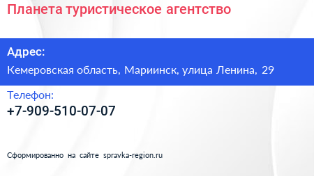 Планета, туристическое агентство по адресу Кемеровская область, Мариинск, улица Ленина, 29 в дальнейшем Организация, размещена в следующих категориях: