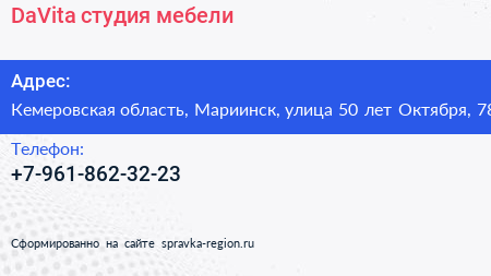 DaVita, студия мебели по адресу Кемеровская область, Мариинск, улица 50 лет Октября, 78 в дальнейшем Организация, размещена в следующих категориях: