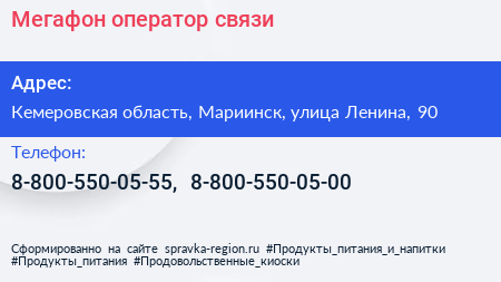 Мегафон, оператор связи по адресу Кемеровская область, Мариинск, улица Ленина, 90 в дальнейшем Организация, размещена в следующих категориях: