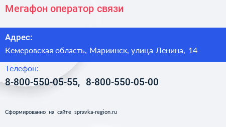 Мегафон, оператор связи по адресу Кемеровская область, Мариинск, улица Ленина, 14 в дальнейшем Организация, размещена в следующих категориях: