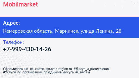 Mobilmarket по адресу Кемеровская область, Мариинск, улица Ленина, 28 в дальнейшем Организация, размещена в следующих категориях: