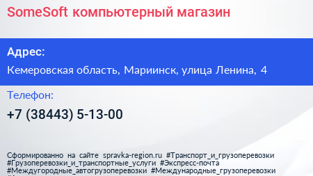 SomeSoft, компьютерный магазин по адресу Кемеровская область, Мариинск, улица Ленина, 4 в дальнейшем Организация, размещена в следующих категориях:
