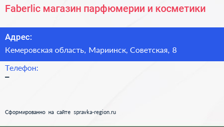 Faberlic, магазин парфюмерии и косметики по адресу Кемеровская область, Мариинск, Советская, 8 в дальнейшем Организация, размещена в следующих категориях: