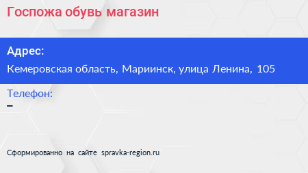 Госпожа обувь, магазин по адресу Кемеровская область, Мариинск, улица Ленина, 105 в дальнейшем Организация, размещена в следующих категориях:
