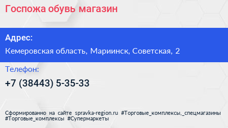 Госпожа обувь, магазин по адресу Кемеровская область, Мариинск, Советская, 2 в дальнейшем Организация, размещена в следующих категориях: