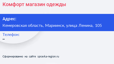 Комфорт, магазин одежды по адресу Кемеровская область, Мариинск, улица Ленина, 105 в дальнейшем Организация, размещена в следующих категориях: