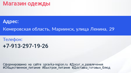 Магазин одежды по адресу Кемеровская область, Мариинск, улица Ленина, 29 в дальнейшем Организация, размещена в следующих категориях: