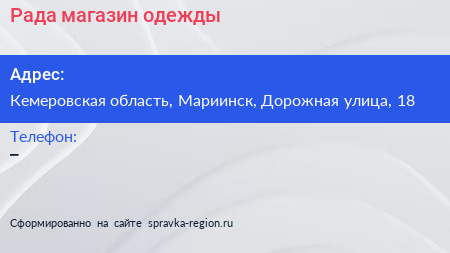 Рада, магазин одежды по адресу Кемеровская область, Мариинск, Дорожная улица, 18 в дальнейшем Организация, размещена в следующих категориях: