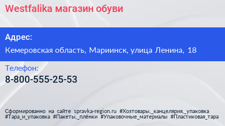 Westfalika, магазин обуви по адресу Кемеровская область, Мариинск, улица Ленина, 18 в дальнейшем Организация, размещена в следующих категориях: