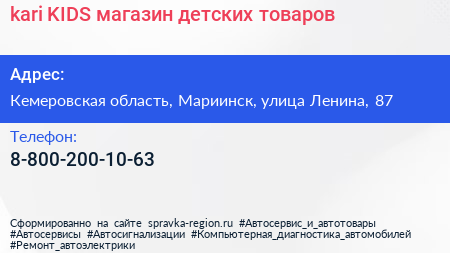 kari KIDS, магазин детских товаров по адресу Кемеровская область, Мариинск, улица Ленина, 87 в дальнейшем Организация, размещена в следующих категориях: