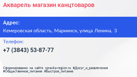 Акварель, магазин канцтоваров по адресу Кемеровская область, Мариинск, улица Ленина, 3 в дальнейшем Организация, размещена в следующих категориях: