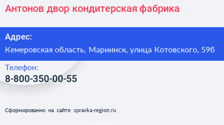 Антонов двор, кондитерская фабрика по адресу Кемеровская область, Мариинск, улица Котовского, 59б в дальнейшем Организация, размещена в следующих категориях: