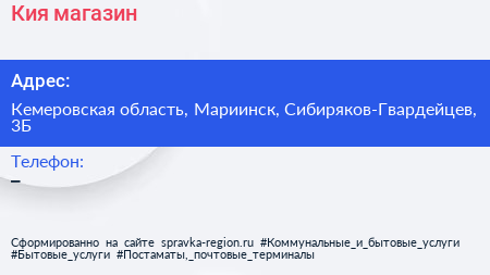 Кия, магазин по адресу Кемеровская область, Мариинск, Сибиряков-Гвардейцев, 3Б в дальнейшем Организация, размещена в следующих категориях: