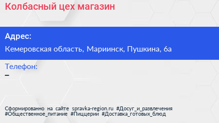 Колбасный цех, магазин по адресу Кемеровская область, Мариинск, Пушкина, 6а в дальнейшем Организация, размещена в следующих категориях: