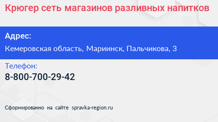 Крюгер, сеть магазинов разливных напитков по адресу Кемеровская область, Мариинск, Пальчикова, 3 в дальнейшем Организация, размещена в следующих категориях: