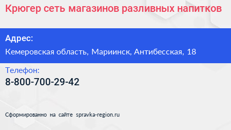 Крюгер, сеть магазинов разливных напитков по адресу Кемеровская область, Мариинск, Антибесская, 18 в дальнейшем Организация, размещена в следующих категориях: