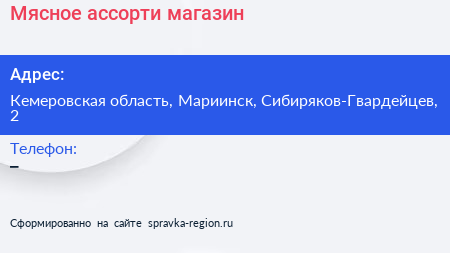 Мясное ассорти, магазин по адресу Кемеровская область, Мариинск, Сибиряков-Гвардейцев, 2 в дальнейшем Организация, размещена в следующих категориях: