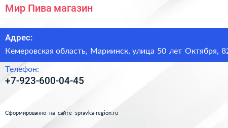 Мир Пива, магазин по адресу Кемеровская область, Мариинск, улица 50 лет Октября, 82 в дальнейшем Организация, размещена в следующих категориях: