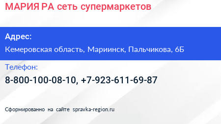 МАРИЯ-РА, сеть супермаркетов по адресу Кемеровская область, Мариинск, Пальчикова, 6Б в дальнейшем Организация, размещена в следующих категориях: