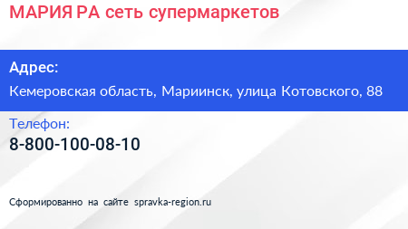 МАРИЯ-РА, сеть супермаркетов по адресу Кемеровская область, Мариинск, улица Котовского, 88 в дальнейшем Организация, размещена в следующих категориях: