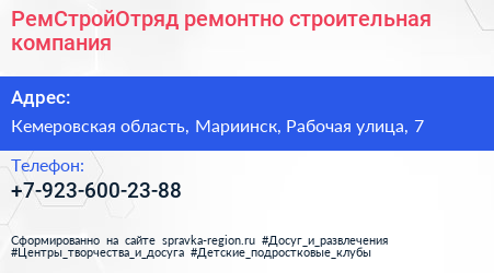 РемСтройОтряд, ремонтно-строительная компания по адресу Кемеровская область, Мариинск, Рабочая улица, 7 в дальнейшем Организация, размещена в следующих категориях: