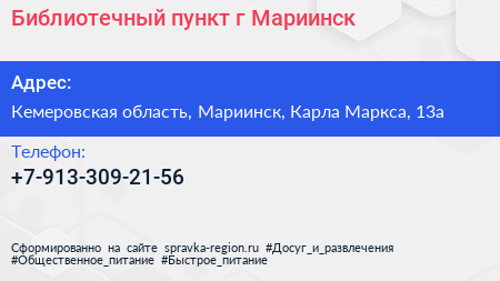 Библиотечный пункт г. Мариинск по адресу Кемеровская область, Мариинск, Карла Маркса, 13а в дальнейшем Организация, размещена в следующих категориях: